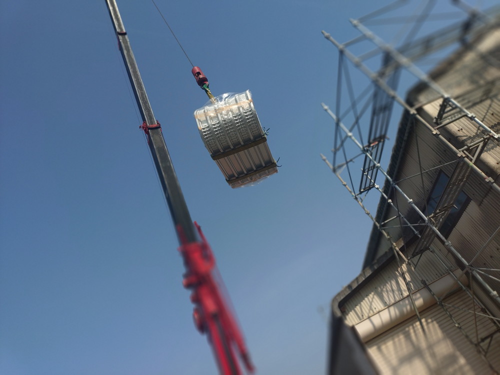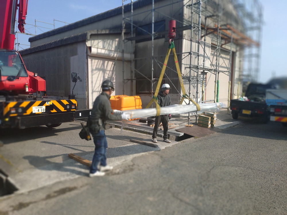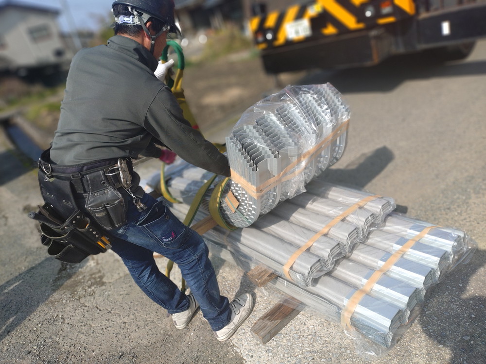 まずはスーパーガルバニウム鋼板部材を屋根へと荷揚げします。