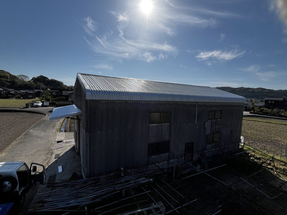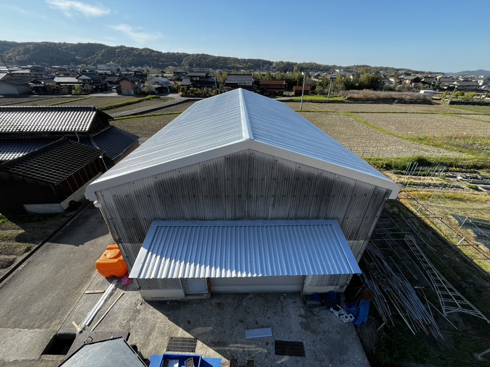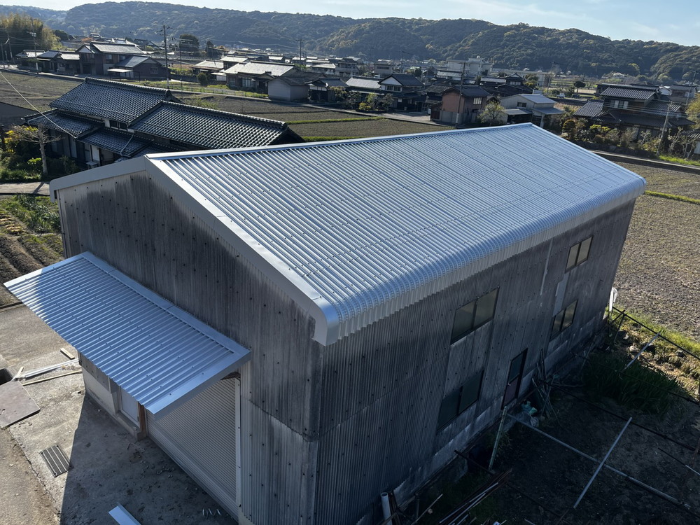 下地のスレート大波の上からスーパーガルバニウムをカバー工法にての仕上がりです。